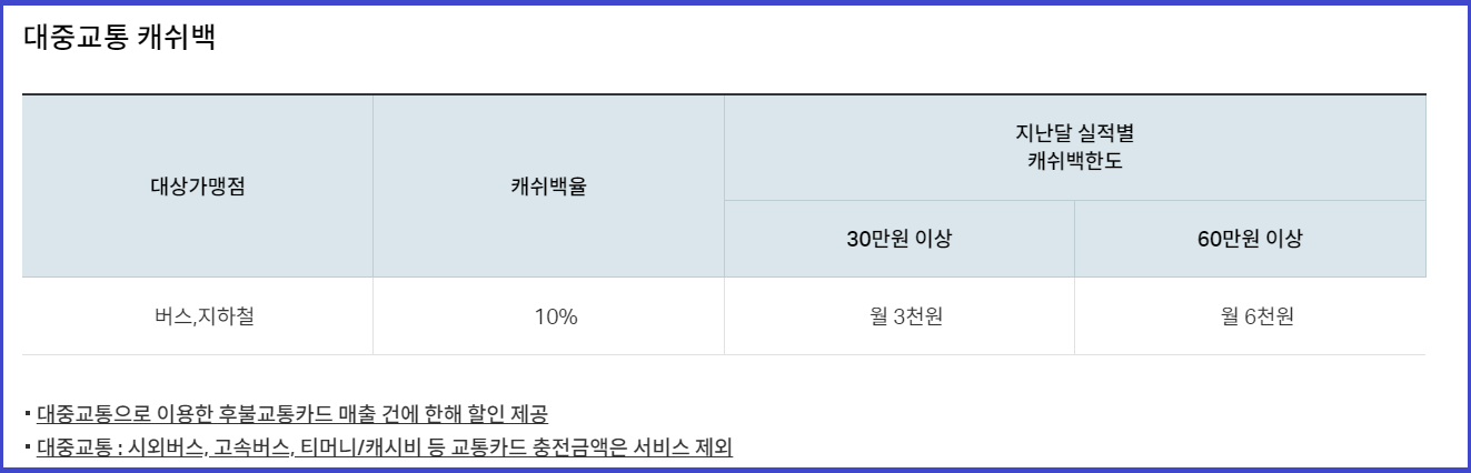 - 버스, 지하철 캐쉬백율(10%), 지난달 실적별 캐쉬백한도 (30만원 이상/월 3천원, 60만원 이상/월 6천원)