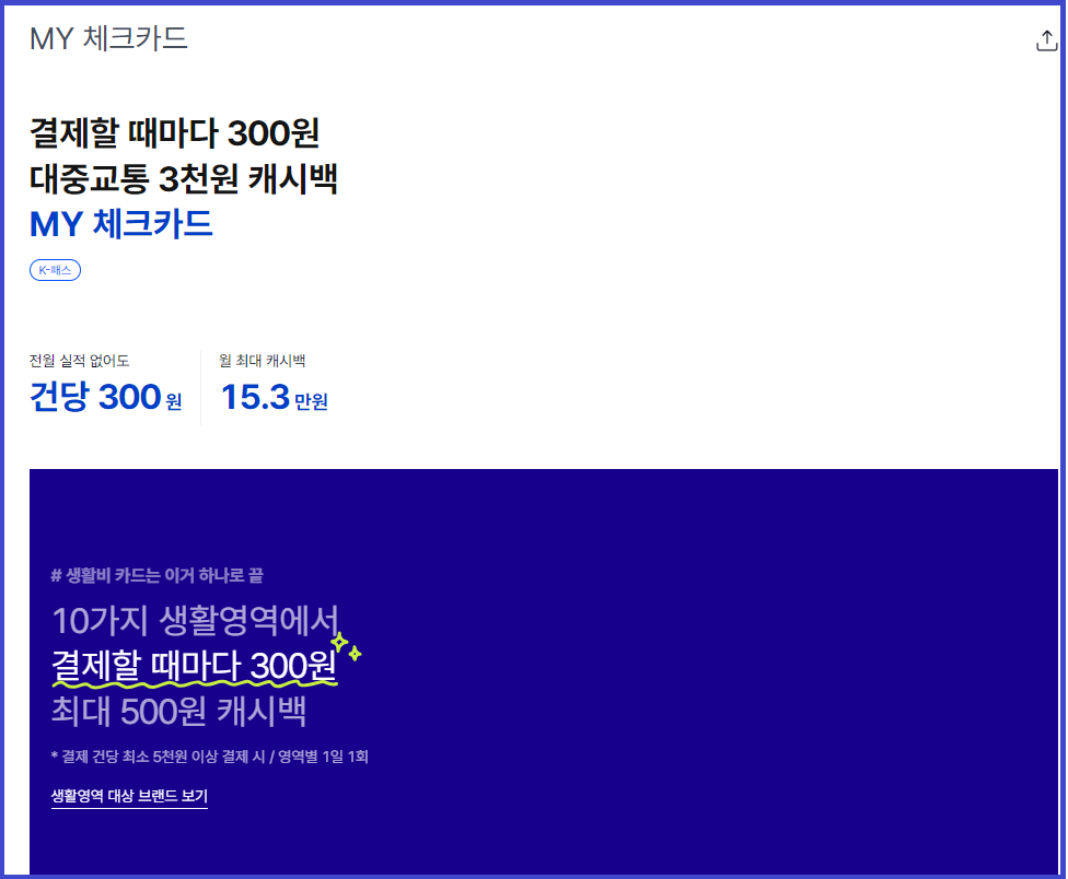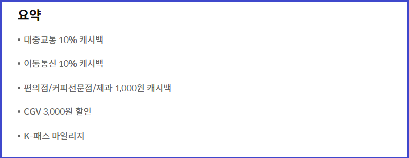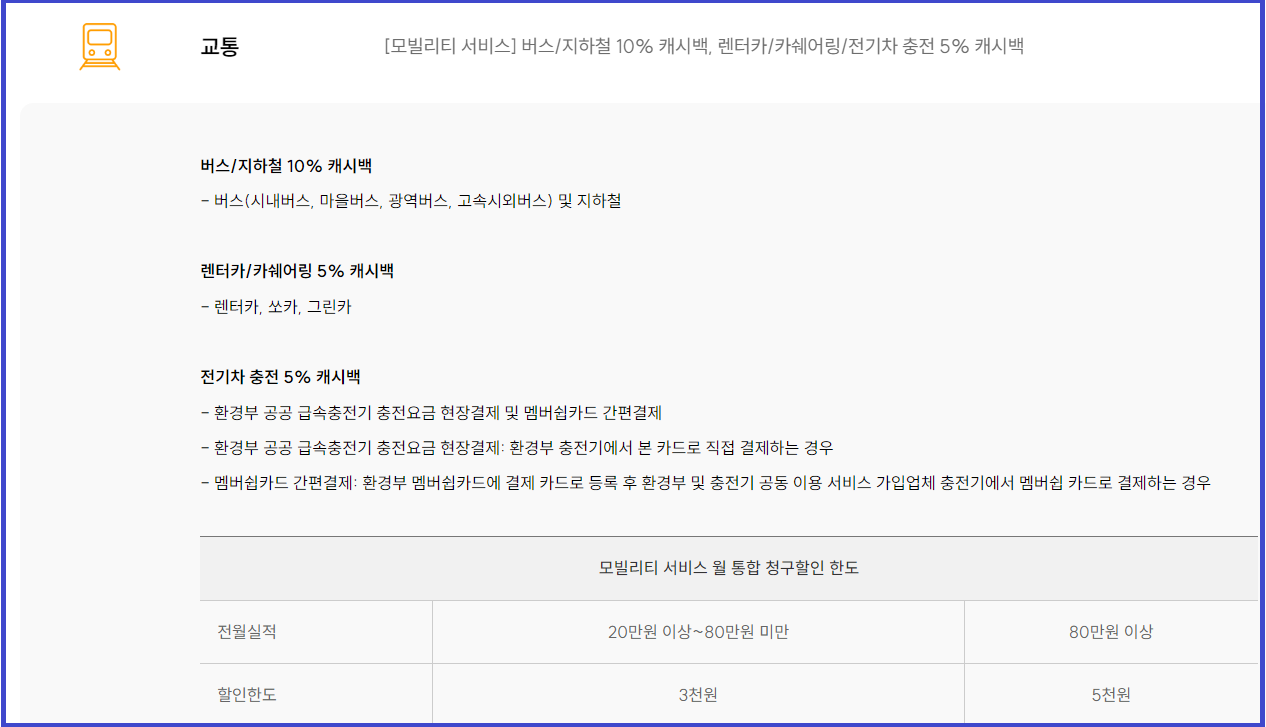 - 버스/지하철 10% 캐시백, 렌터카/카쉐어링/전기차 충전 5% 캐시백