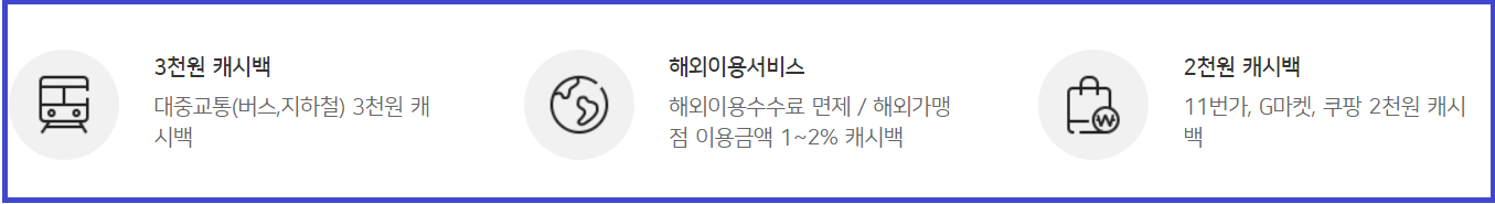 - 해외이용수수료 면제 / 해외가맹점 이용금액 1 ~ 2% 캐시백